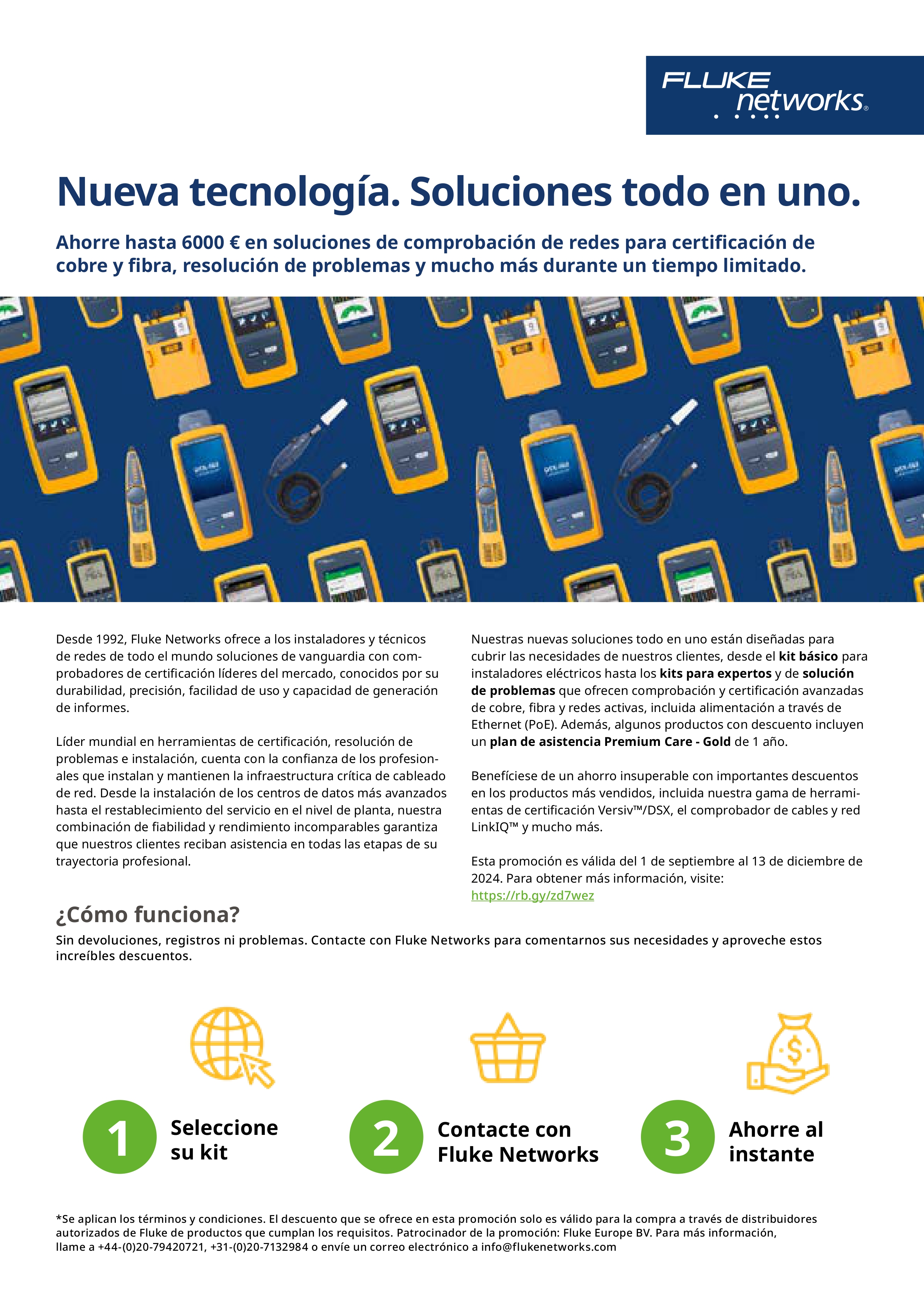 Fluke Networks lanza una promoción imperdible: ahorra hasta 6000€ en soluciones de comprobación de redes. Desde certificación de cobre y fibra hasta resolución de problemas, las herramientas todo en uno de Fluke Networks cubren todas tus necesidades. Con la confianza de profesionales en todo el mundo, Fluke Networks ofrece durabilidad, precisión y facilidad de uso incomparables. ¡No te pierdas esta oportunidad!