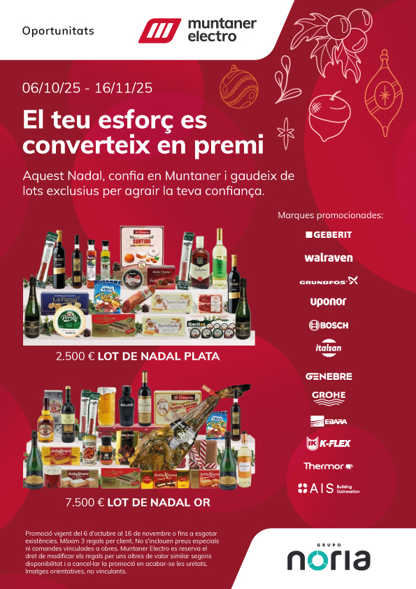 Promoció vigent del 6 d’octubre al 16 de novembre o fins a esgotar existències. Màxim 3 regals per client. No s’inclouen preus especials ni comandes vinculades a obres. Muntaner Electro es reserva el dret de modificar els regals per uns altres de valor similar segons disponibilitat i a cancel·lar la promoció en acabar-se les unitats. Imatges orientatives, no vinculants.